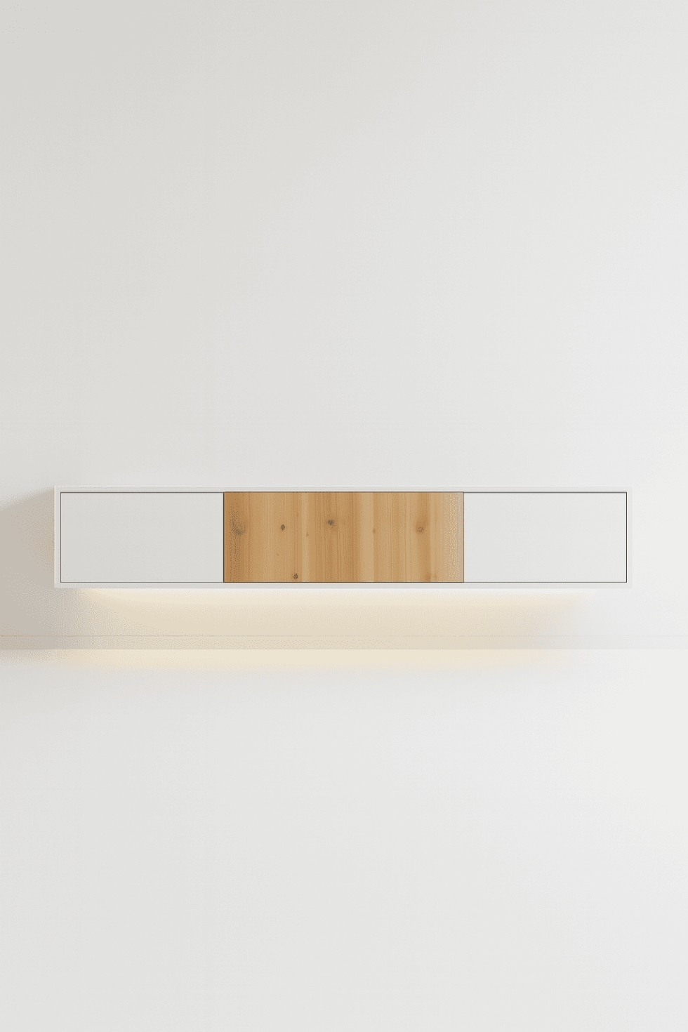 Rack flutuante em MDF/MDP branco, com uma gaveta central em tom de madeira natural, criando um contraste elegante.